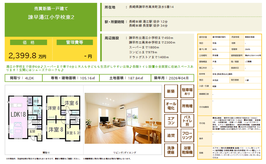 一覧へ戻る 【新築平屋物件のご案内~諫早市高来町~】2026-02-03注目他社不動産より、新築平屋物件の販売情報が届きました。当社でもご紹介可能な物件となっております。詳細や見学のご相談は、お気軽にお問い合わせください!